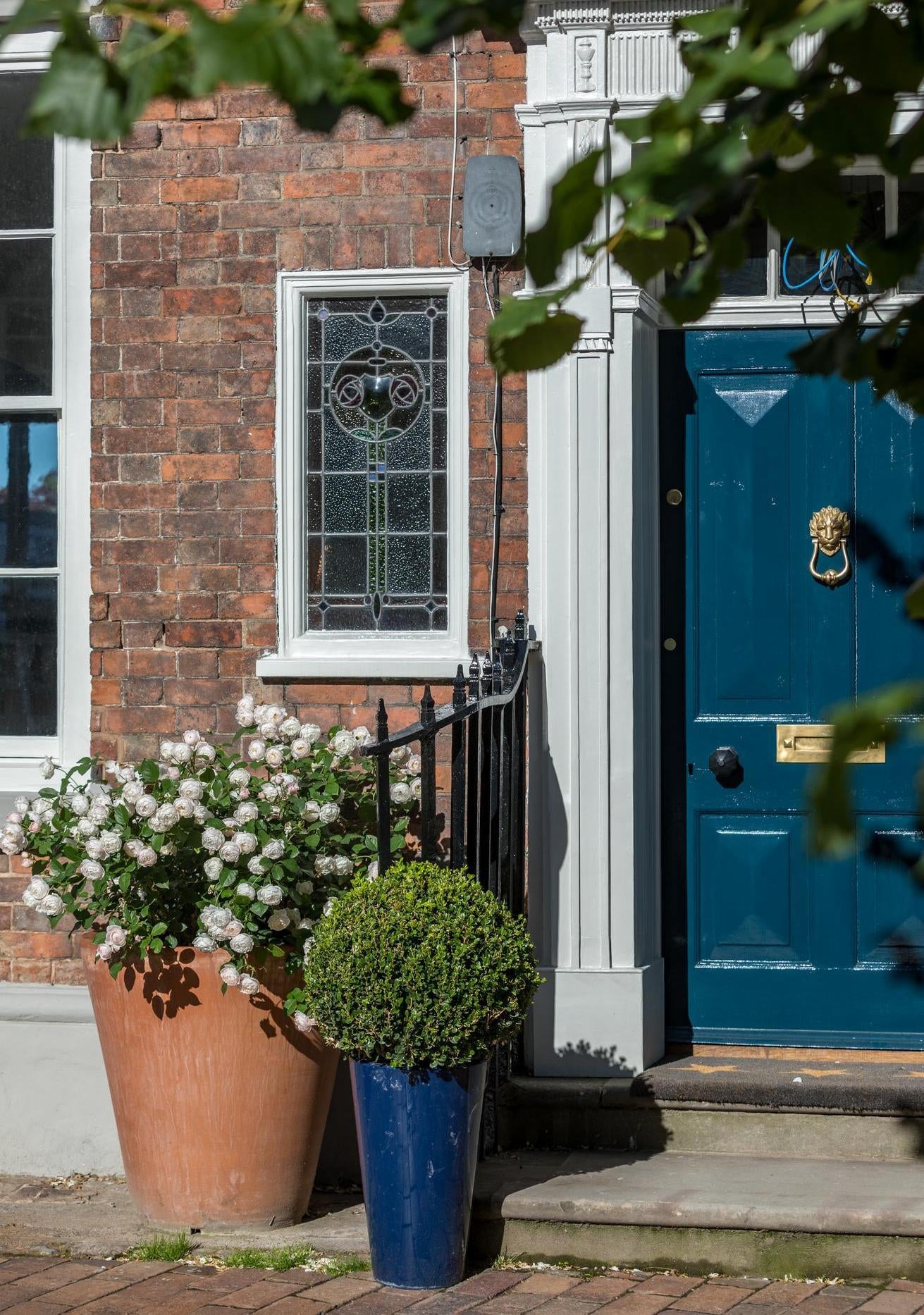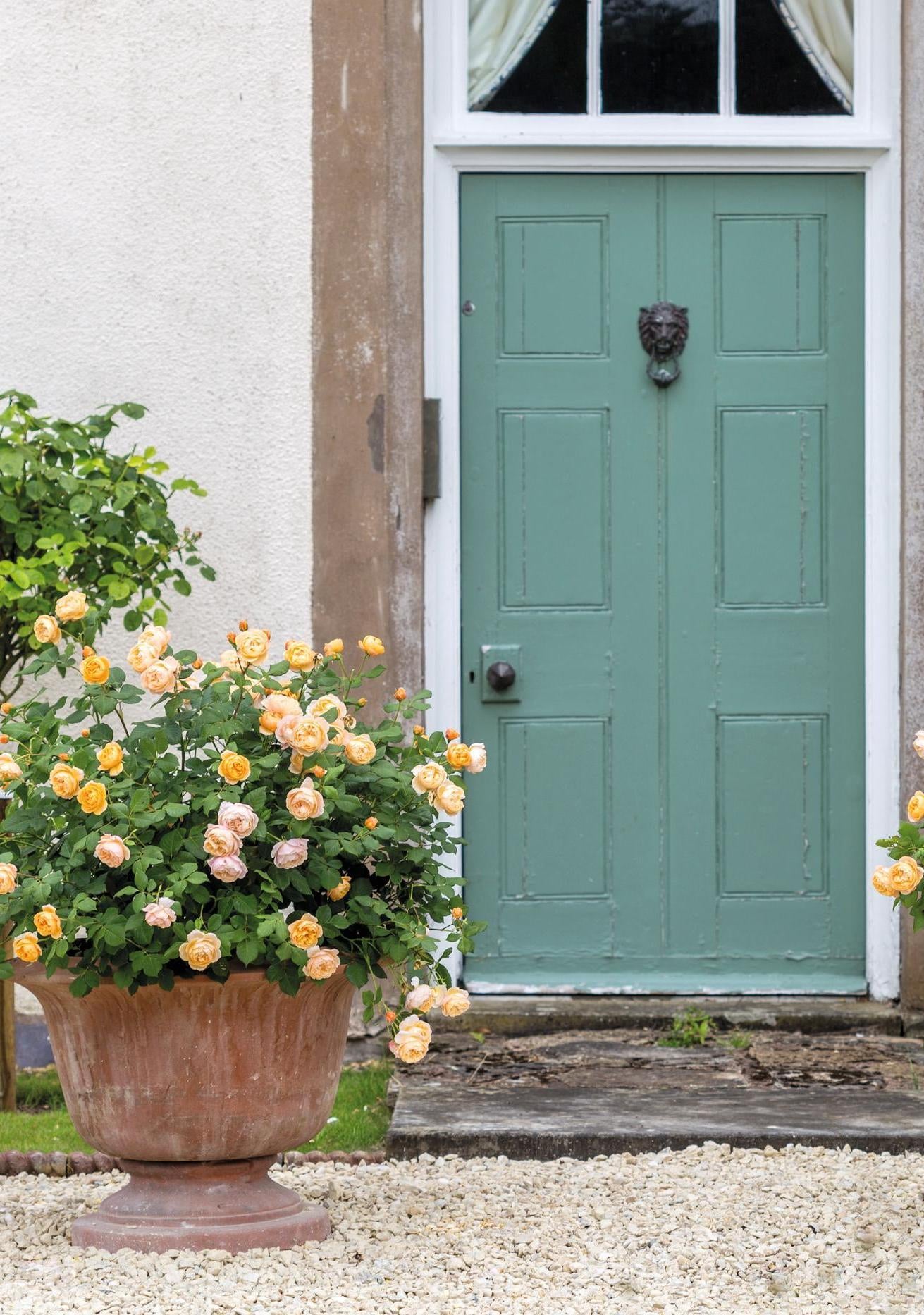 Roses are wonderful plants for growing in pots. Choose a contrasting colour to your door to make a beautiful, colourful feature.