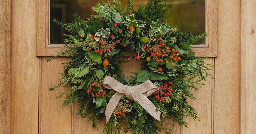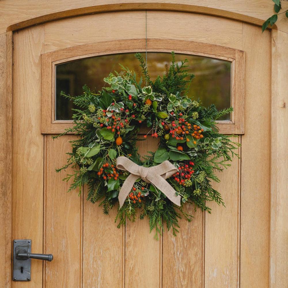 Tie a ribbon around the top of your wreath. Choose something that suits the tone you want: a deep green or burgundy for a traditional look, or soft linen or jute if you prefer something simple and understated.