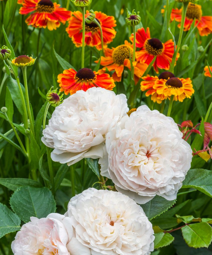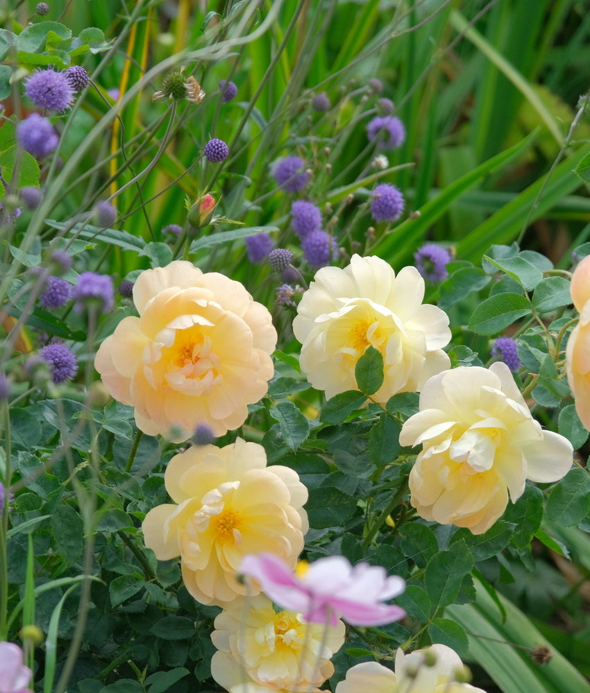 In a mixed border, combine shrub roses, other shrubs, perennials and annuals to create a tapestry of different colours and textures. Avoid over crowding beds and borders and choosing vigorous companion plants, which will create too much competition with the roses.