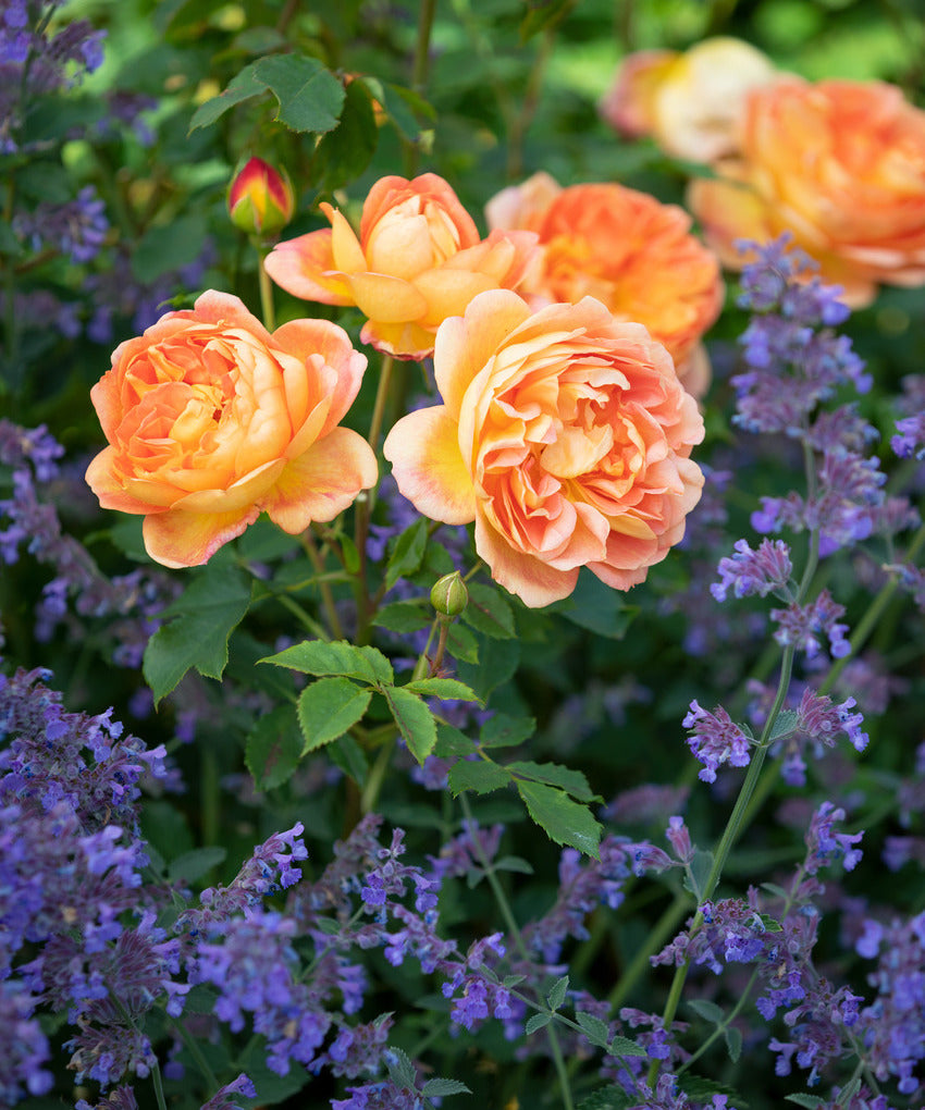 Nepeta (catmint) is an excellent choice for attracting beneficial insects. It is low-maintenance and can be planted with all roses, but its soft blue flowers pair wonderfully with yellow and orange roses, such as Tottering-by-Gently®, Dannahue® (Ausa6b15),Bring Me Sunshine® (Ausernie) and Lady of Shalott® (Ausnyson)adding variety and visual appeal to your garden.