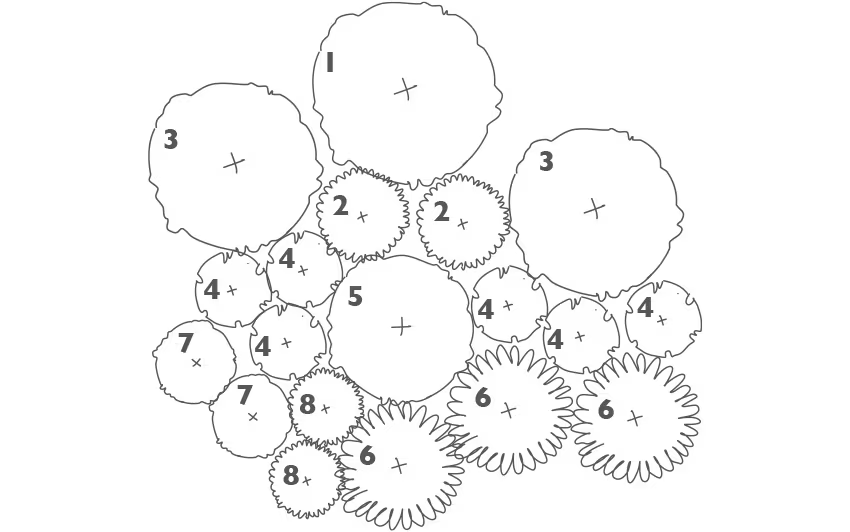 When planning your mixed border it is important to allow enough space for the mature space of the plant. See our Planting Guide here. Immediately after planting it may look a bit sparse,but this will change as the plants mature. It can be helpful to place the plants out in their pots to ensure you have allowed enough space. Also consider the height of the mature plants, taller plants placed towards the back, getting gradually shorter towards the front of the border. Placing the smaller sedum at the front will help to obscure the lower part of the rose stems which can look bare once mature, giving a finished appearance to your border.