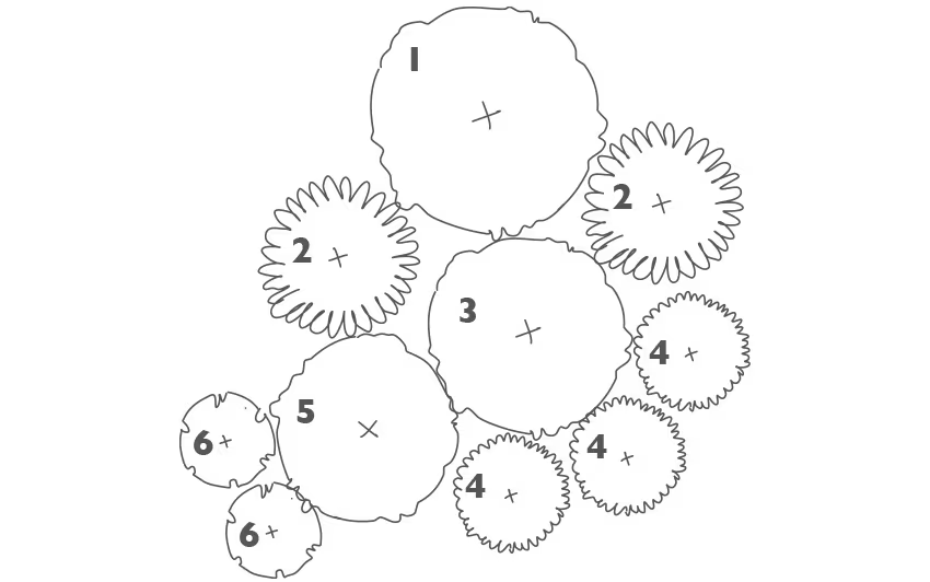 It is important to consider foliage colour as well as bloom colour. The three different apricot rose varieties give a gentle variance of warm blooms which are lifted further by the golden grasses and topped off with the dark copper-toned sedums. The addition of the lighter green grasses at the back compliment the darker green foliage of the roses. The thin, airy grasses offset the larger more dense rose shrubs creating a combination of textures. The three rose varieties feature slightly different bloom shapes which add a subtle variety with the compact shape of the sedum at the front adding further interest.