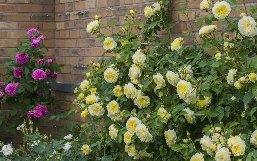 Roses need a little help to climb. Fix horizontal wires across your wall or fence, spacing them about 30 centimetres apart. Gently tie in the stems as they grow, encouraging them to spread out horizontally rather than upwards too quickly. This helps create more flowers along the length of the plant rather than just at the top.