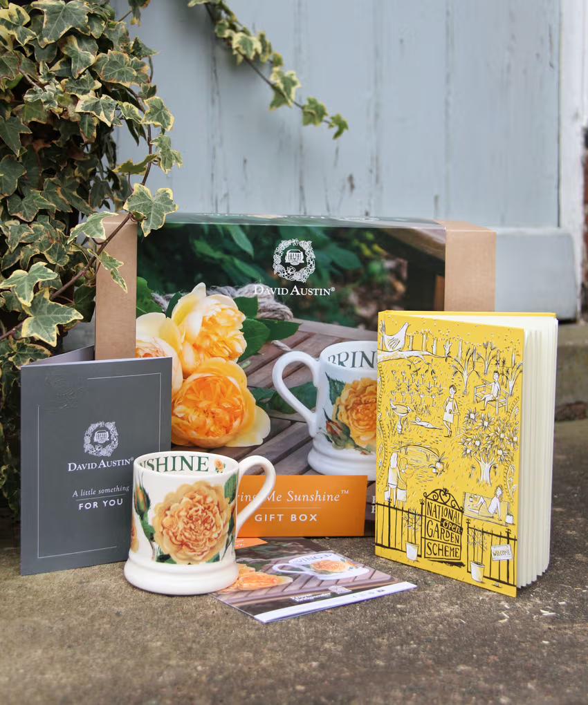A gift box bursting with sunshine! For seasoned rose enthusiasts or novices alike, our Bring Me Sunshine gift box not only celebrates English Roses and British pottery, it also has a charitable connotation and celebrates the thousands of open gardens that are part of the National Garden Scheme.