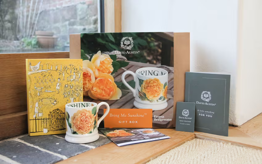 A gift voucher for a rose of the recipient’s choice (including free delivery), a charming Emma Bridgewater ½ Pint Mug featuring our Bring Me Sunshine® rose and a handy National Garden Scheme notebook to pencil in your gardening notes.