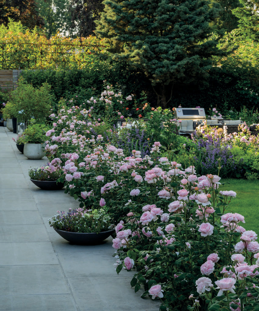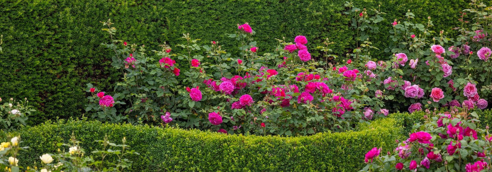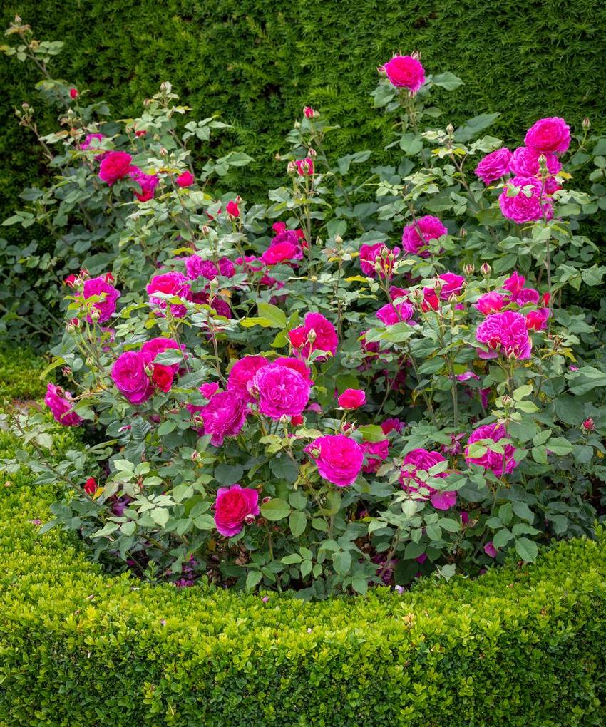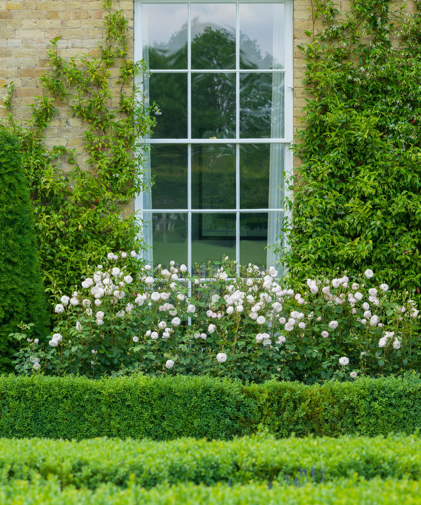 Rose hedges can be used to frame perimeters of buildings to spectacular effect. More simple to plan and maintain than a mixed bed or border, a dedicated rose hedge can provide protection and privacy without being imposing. For extra grandeur, consider a double hedge by lining your hedgerow with a small box hedge, rather like framing a picture.