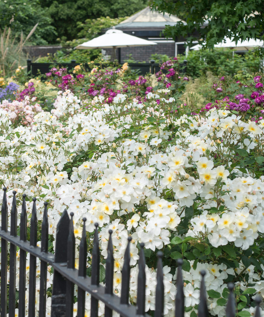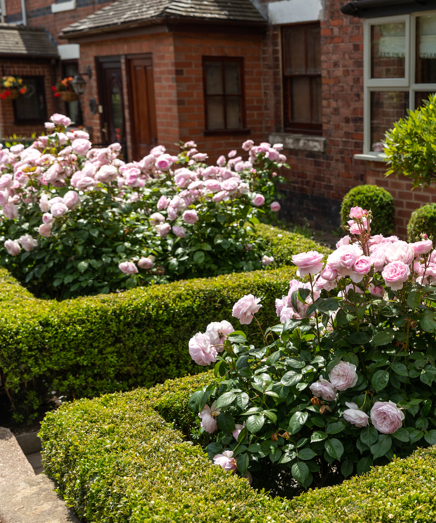 For smaller spaces and narrow streetside gardens, a rose hedge will provide consistent colour during the summer months. Easy to maintain, a simple line of shrub roses or a horizontally trained rambler will transform even the simplest space into a kerbside floral oasis.