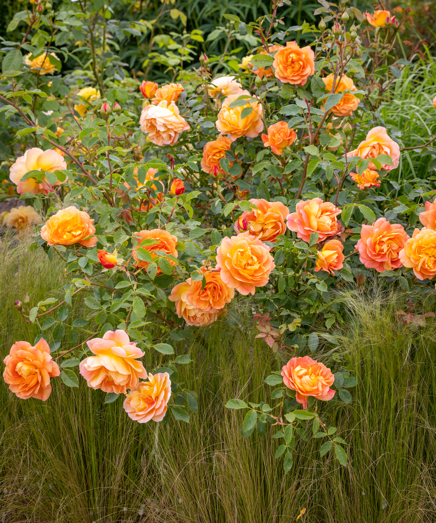 Rosa 'Lady of Shalott® (Ausnyson) shown planted behind ornamental grasses.LADY OF SHALOTT®