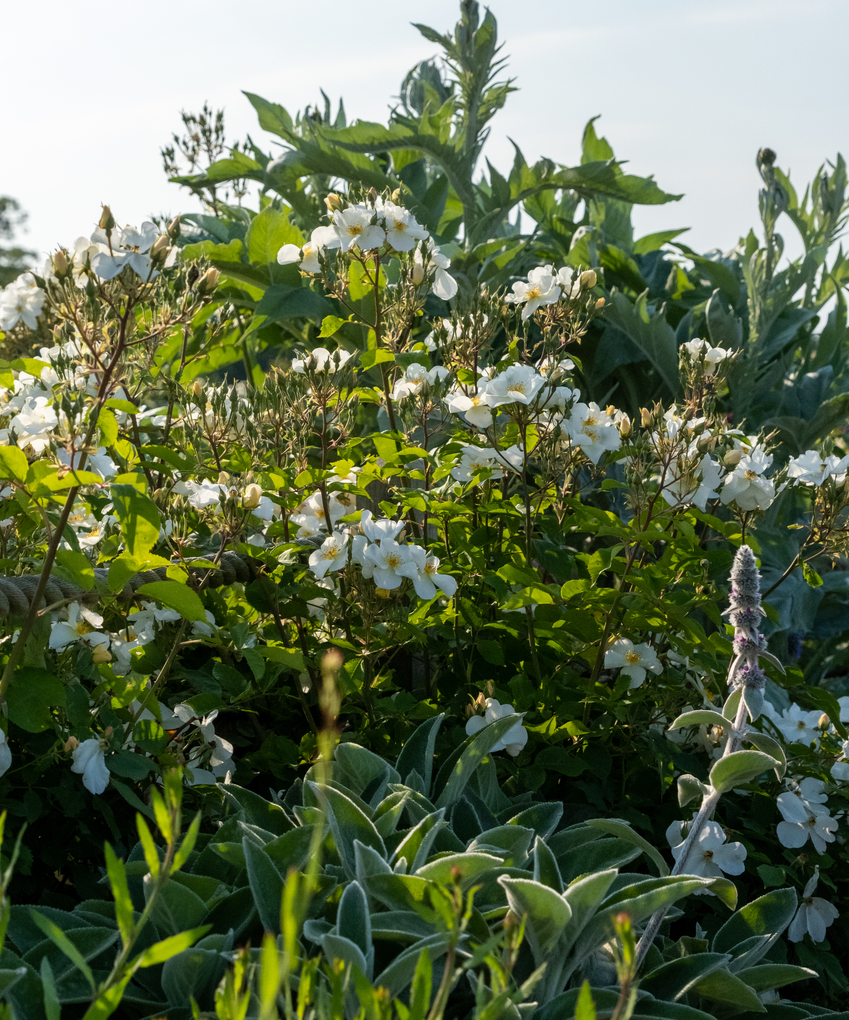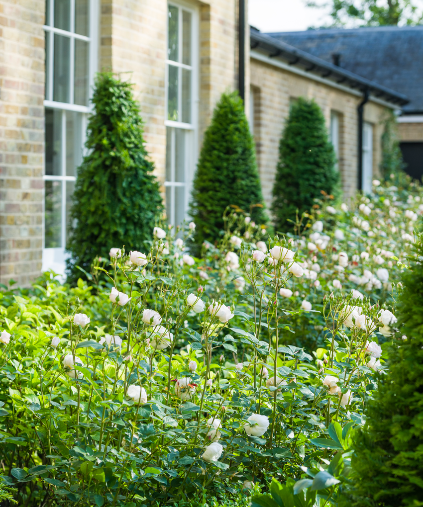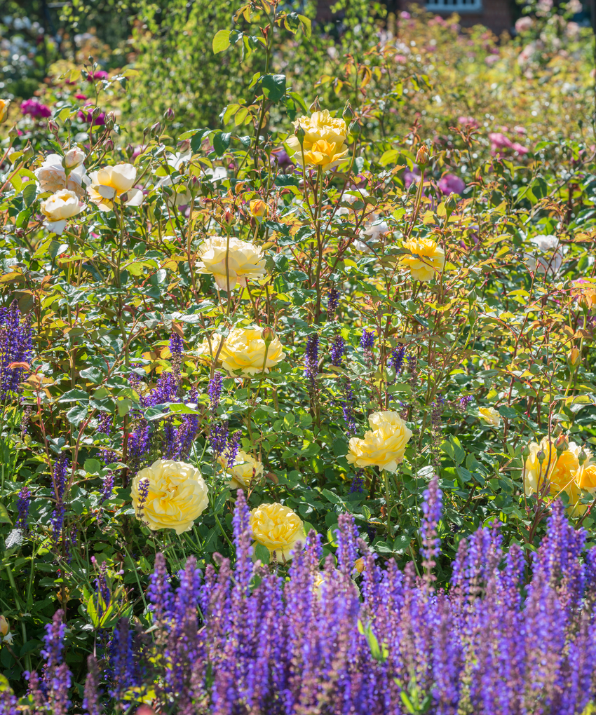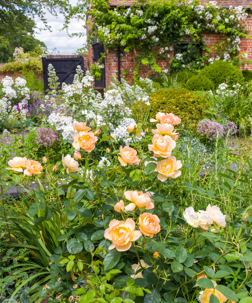In a mixed border, combine shrub roses, other shrubs, perennials and annuals to create a tapestry of different colours and textures. Avoid over crowding beds and borders and choosing vigorous companion plants, which will create too much competition with the roses.