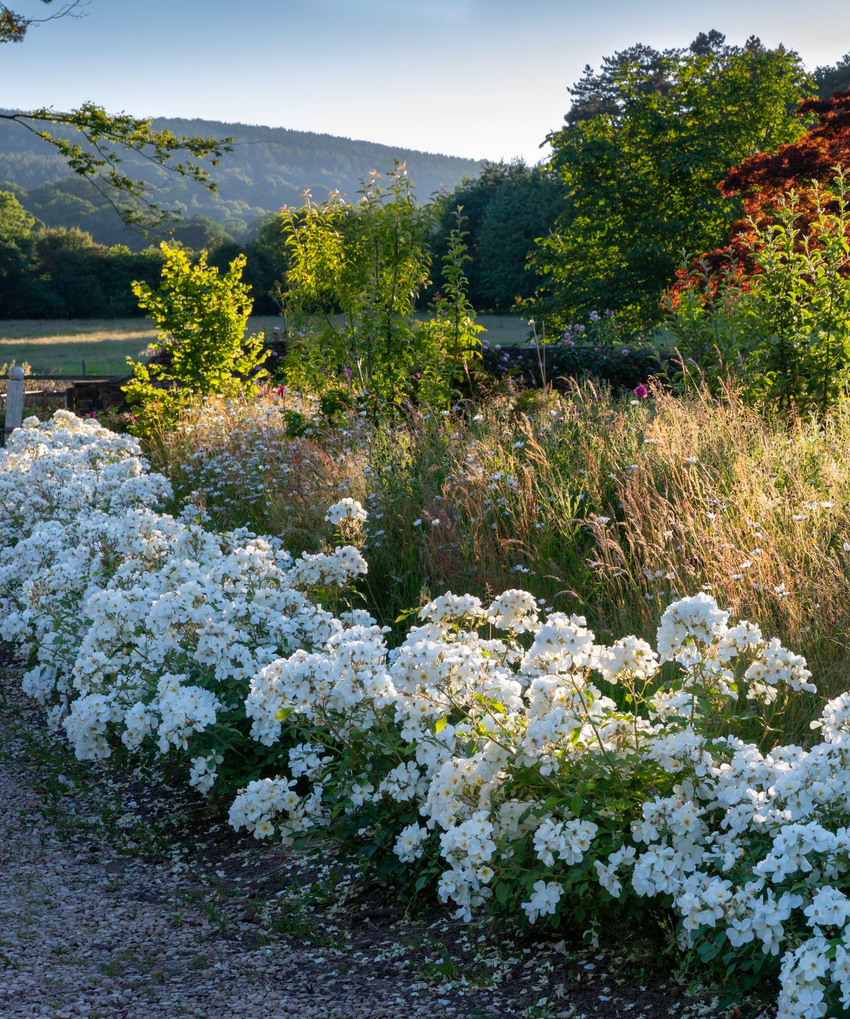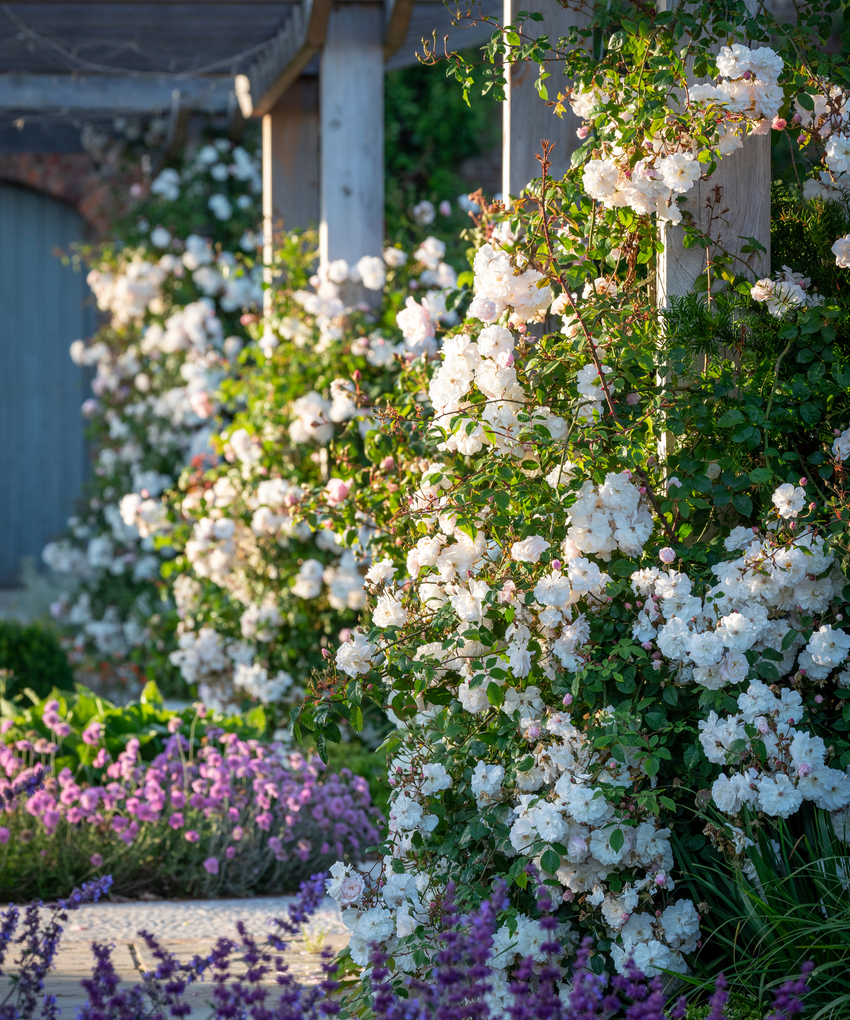 When planning an outdoor space it is important to step back and consider the whole view. Layering a white climbing or rambling rose behind a shrub border will add depth and interest, both up close and from afar.