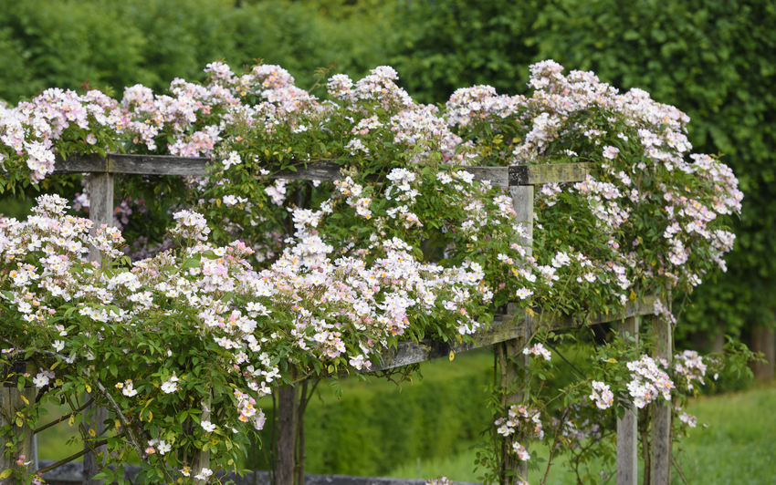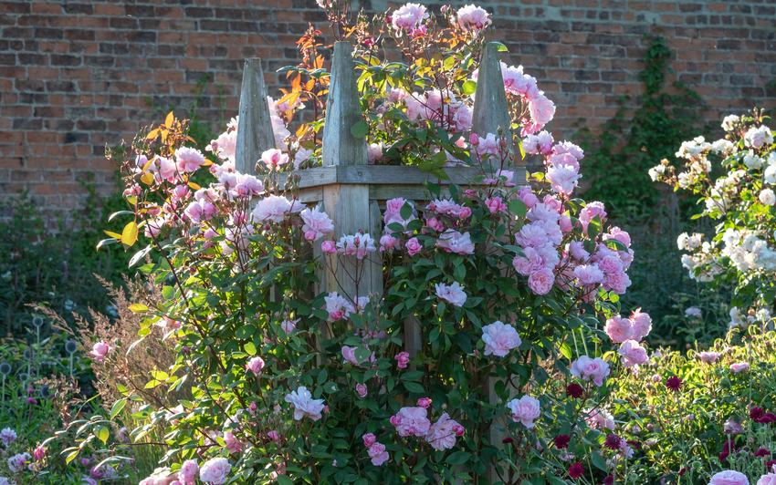 For the uprights of your pergola, train your rose in a similar manner to training it up a pillar; training the stems in an upwards spiral. For the canopy above, first train a rose up one of the uprights, then, once the rose reaches the top of the structure. begin to tie-in shoots to the cross beams to create the 'roof'. You are aiming to cover the whole structure in blooms.