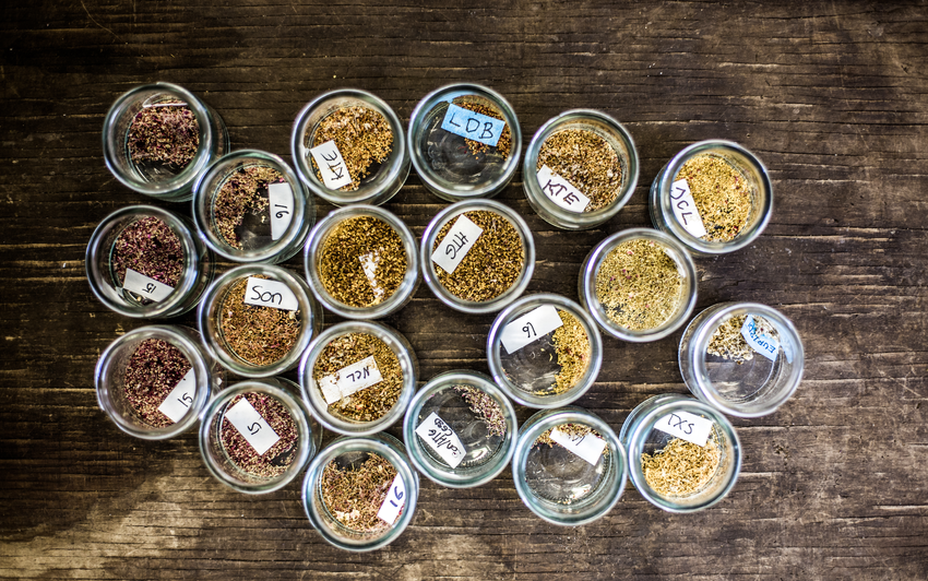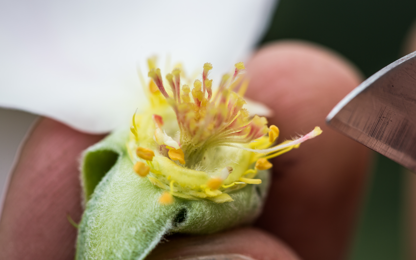 Having selected suitable parents we collect the pollen from one parent and place it onto the stigma of the other. This process is called cross-pollination and would naturally be carried out by bees. Each year we do 40,000 individual cross-pollinations, all by hand, using a small knife to remove the pollen from the first parents and a paintbrush to apply it to the other parent.